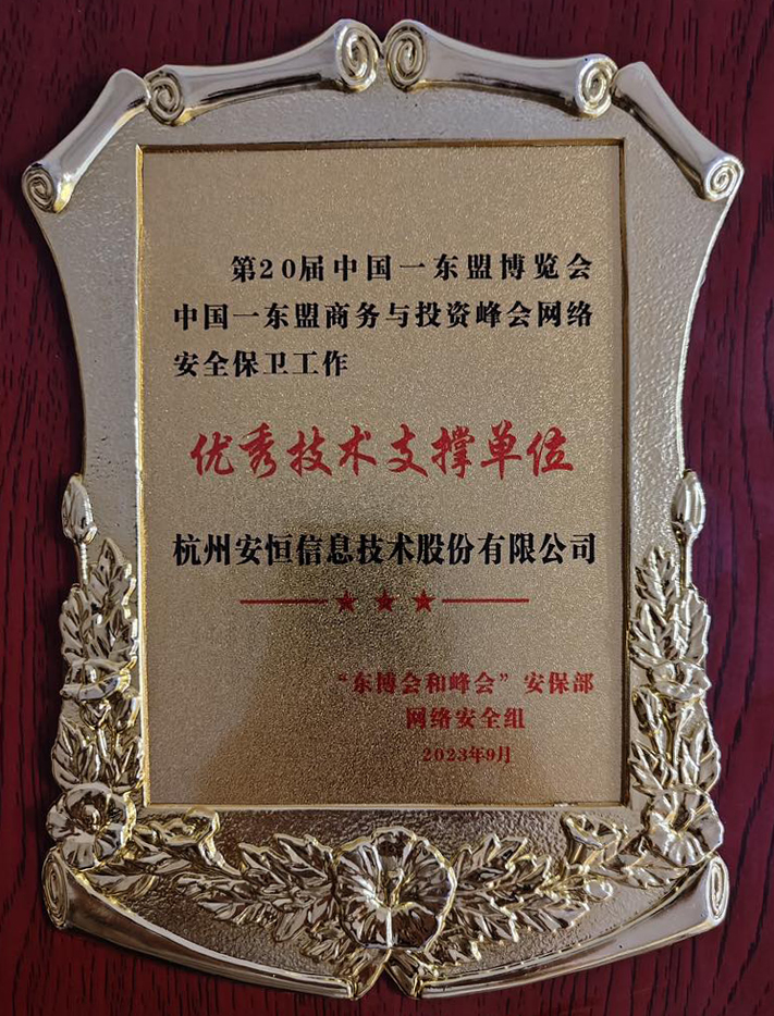 在为期四天的中国—东盟博览会、峰会中,安恒信息网络安保团队在网络安全主管部门的统筹指导下,7X24小时现场值守,对安全事件及时响应、实时分析、有效处理,圆满完成了此次网络安保任务,被授予了“优秀技术支撑单位”的荣誉。