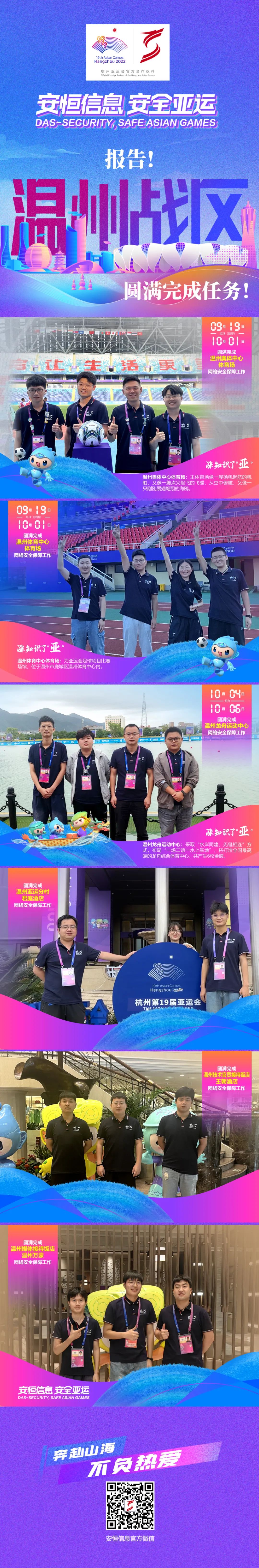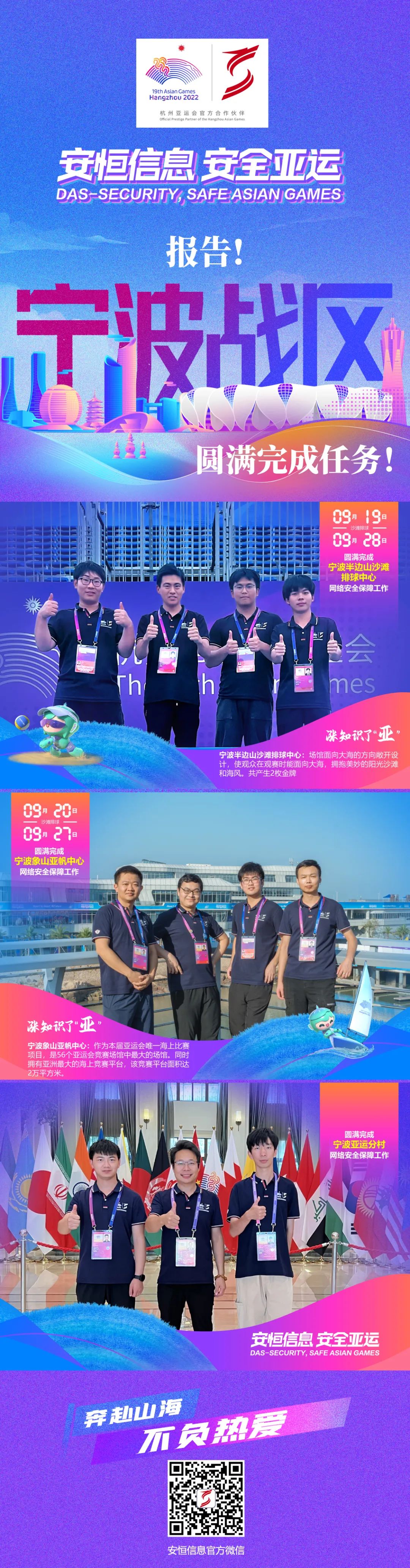 在此前的9月28日,安信信息同样为宁波赛事的网络安全保障工作交上完美答卷。至此,安恒信息六大主战区,已有两大战区完成保障任务!