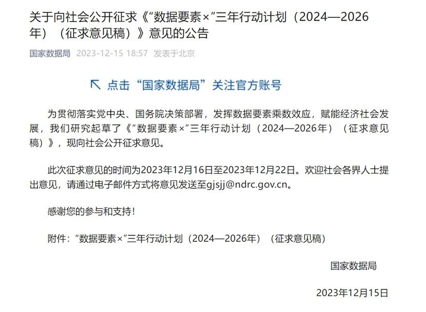 解读丨国家数据局《“数据要素×”三年行动计划(2024-2026)(征求意见稿)》
