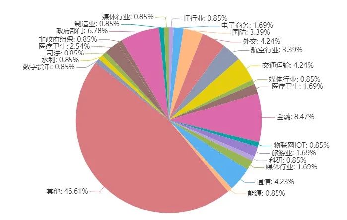 11月多数行业均遭到不同程度的恶意威胁,按照攻击行业,分布如下,其中政府部门、金融、外交、通信、交通运输收录内容占比较高。