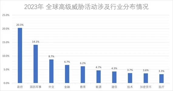 《报告》指出,全球的复杂局势,使得2023 年高级威胁活动主要专注于攻击政府、国防军事、外交、通信和能源等关键行业。政府机构是攻击的首要目标,因为涉及到国家治理、决策制定和国家安全的核心职能。针对国防军事领域的攻击旨在窃取军事机密、战略计划和军事技术,对国家的军事优势构成直接威胁。