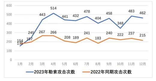 《报告》显示,2023 年共发生 4832 起勒索软件攻击事件,较 2022 年的 2640 起相比,攻击次数整体呈现近乎一倍的巨幅增长。以每月攻击次数的平均值来看,2022 年平均每月攻击次数约为 220 次,而 2023 年则增至约为 402 次,增幅高达约 82.73%。