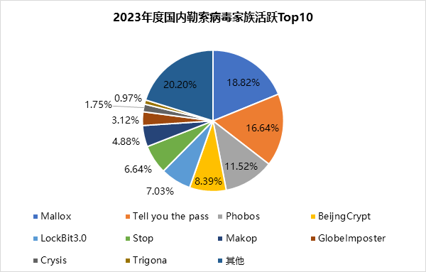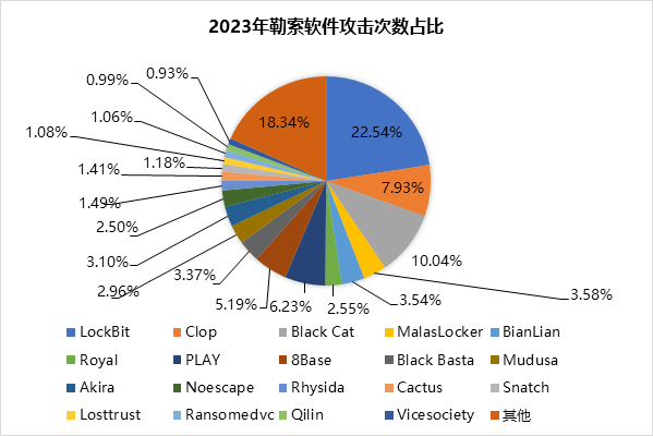 2023年,勒索软件攻击展现出前所未有的多样性和动态演变特点。全年中,LockBit、BlackCat、Clop、Play和8Base五大勒索团伙尤为活跃,其中LockBit更是以高达1089次的攻击频率稳居榜首。同时,新型勒索家族的涌现也不容小觑,它们来势汹汹,占据了今年最活跃勒索团伙前20名中的半数席位,这充分揭示了勒索生态系统正在不断完善和持续发展的严峻现实。