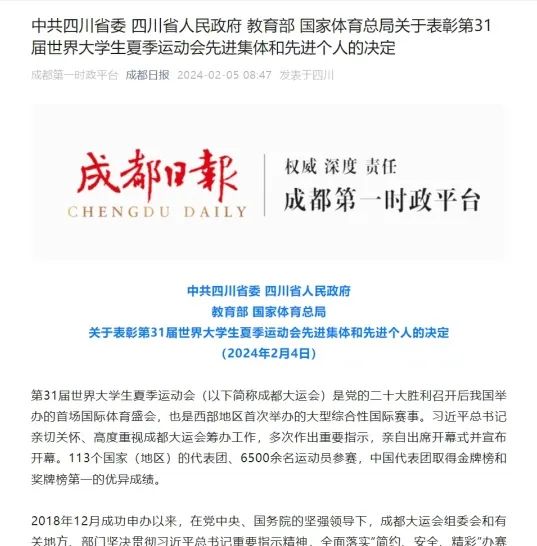 2024年2月4日,为表彰先进、树立典型,激励广大干部群众建功新时代、奋进新征程,中共四川省委、四川省人民政府、教育部、国家体育总局决定,授予成都大运会龙泉驿赛区委员会等集体“第31届世界大学生夏季运动会先进集体”称号,安恒信息获此称号。