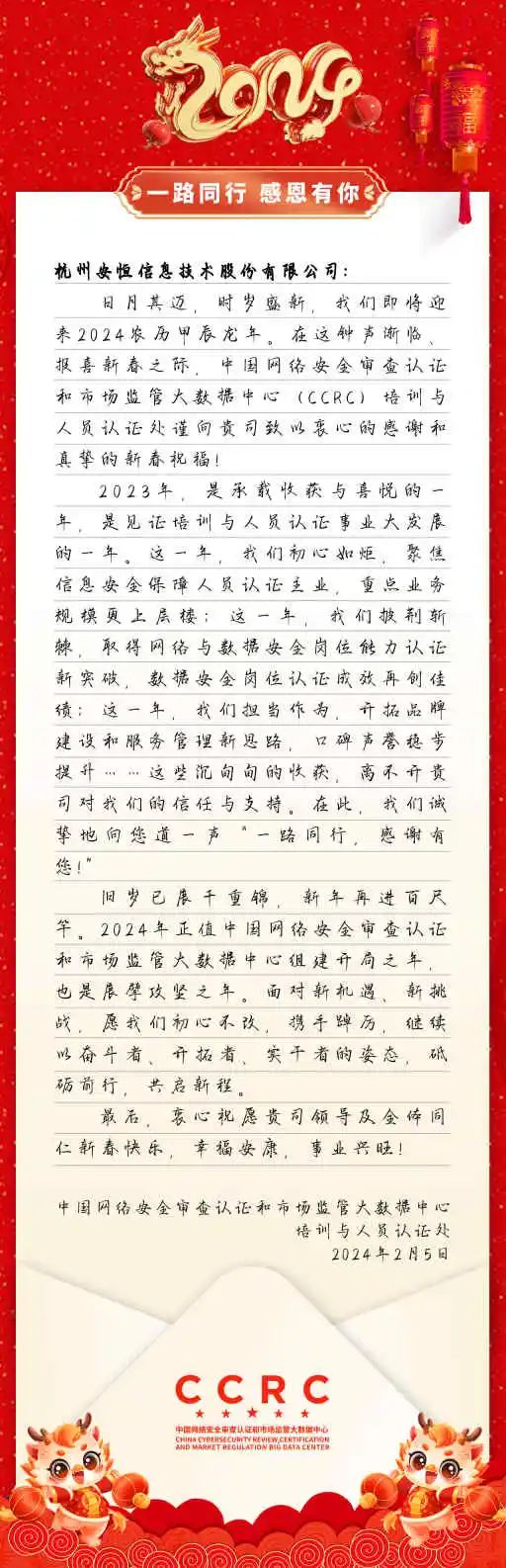 值此年末春将至之际,一封来自于中国网络安全审查认证和市场监管大数据中心培训与人员认证处(下简称“培训与人员认证处”)的新春祝福信款款而来,对安恒信息这一年的贡献做出感谢。