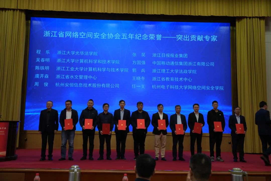此外,安恒信息董事长范渊等人分别荣获五年纪念荣誉——突出贡献者、杰出会员、突出贡献专家、优秀联络员等奖项。