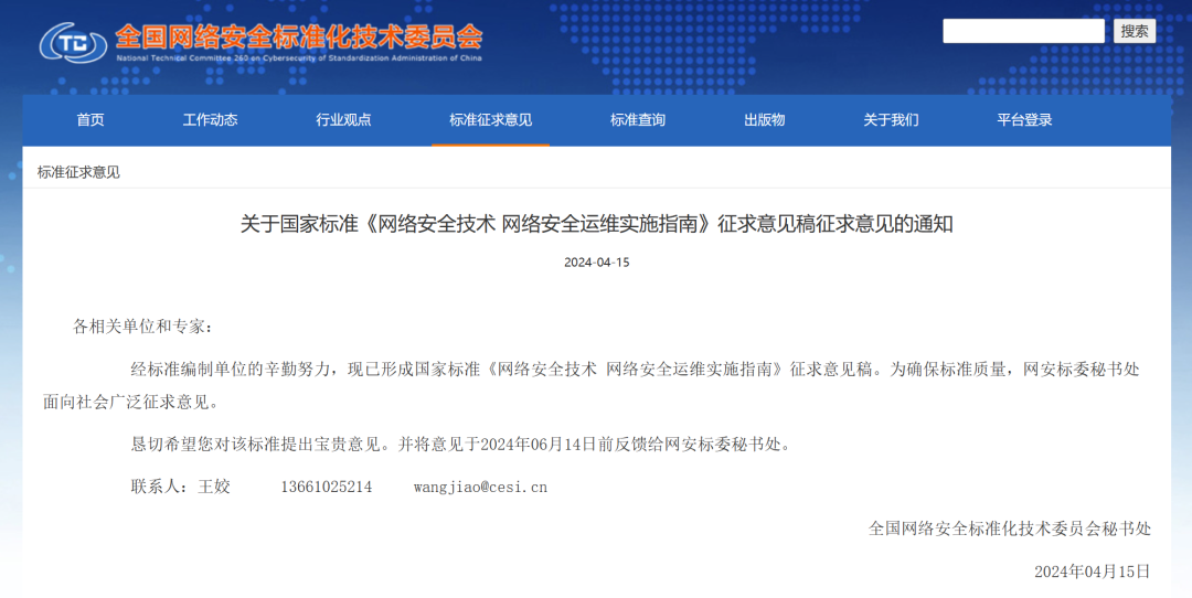 4月15日,全国网络安全标准化技术委员会发出通知,国家标准制定项目《网络安全技术 网络安全运维实施指南》正式面向社会发布征求意见稿,征求意见时间从4月15日到6月14日,为期2个月。