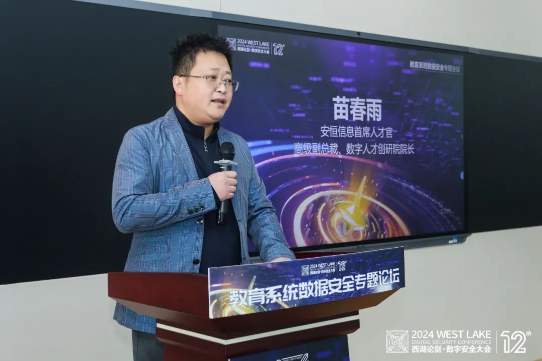 安恒信息首席人才官、高级副总裁、数字人才创研院院长苗春雨在致辞中表示,教育部高度重视教育行业的网络安全和数据安全工作。作为教育部重要的合作伙伴,安恒信息与教育行业一直保持着良好的合作关系,并多年来持续支持教育行业的网络安全防护建设,为维护教育安全和数据安全贡献了安恒力量。面对严峻的网络和数据安全挑战,安恒信息将立足自身技术优势,致力于在主管部门的指导和帮助下,与各位伙伴携手同行,为智慧教育保驾护航。