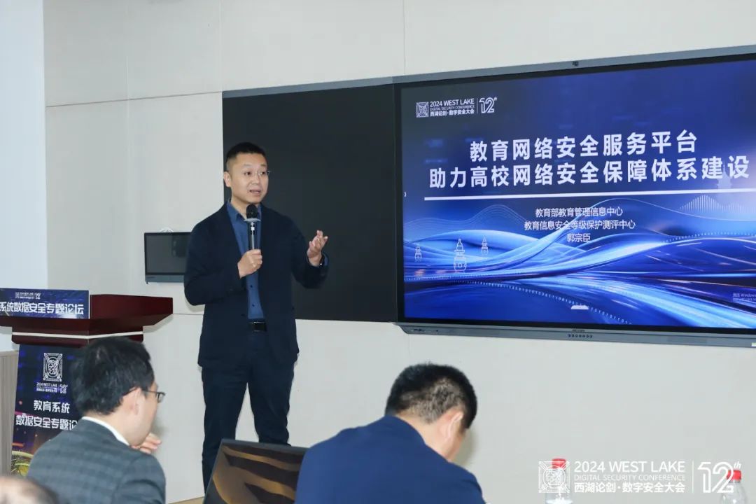 教育信息安全等级保护测评中心副主任郭宗臣带来《教育网络安全服务平台助力教育网络安全保障体系建设》主题分享,为现场嘉宾阐述了教育信息安全等级保护测评中心如何围绕网络安全、密码安全、数据安全、人工智能安全等议题,集中优势资源,为各级教育行政部门和高校提供专业技术服务,打造教育系统一站式线上网络安全服务平台的实践,彰显出教育信息安全的前沿技术与理念。