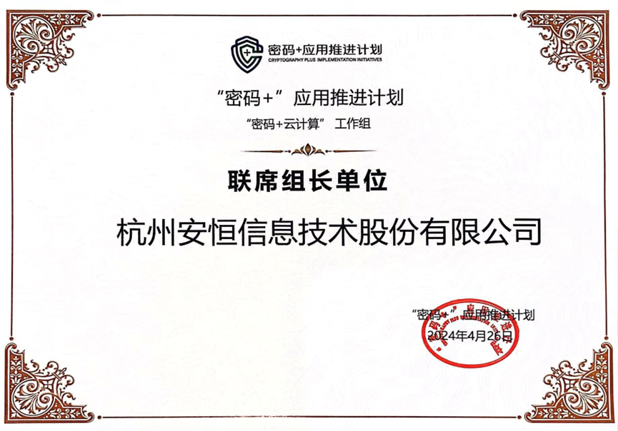 “密码+云计算”工作组联席组长单位证书
