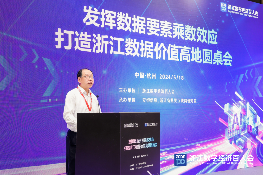 5月18日,浙江数字经济百人会(以下简称“百人会”)主办,安恒信息、浙江省图灵互联网研究院承办的“发挥数据要素乘数效应 打造浙江数据价值高地”圆桌会(以下简称“圆桌会”)在杭州举办。本次活动由百人会成员、浙江省政府咨询委委员、浙江省信息化发展研究院首席专家陈畴镛主持。中国工程院院士邬江兴,百人会执委、浙江省政府咨询委委员厉敏,百人会执委、浙江省政府办公厅副主任、党组成员陈新忠,浙江省数据局党组成员、副局长陈瑜,青岛市委机要保密局局长刘伟政等60余人齐聚一堂,共同探讨浙江如何发挥数据要素的乘数效应,探索数据从资源到资产到资本的价值实现路径,打造浙江数据价值高地。