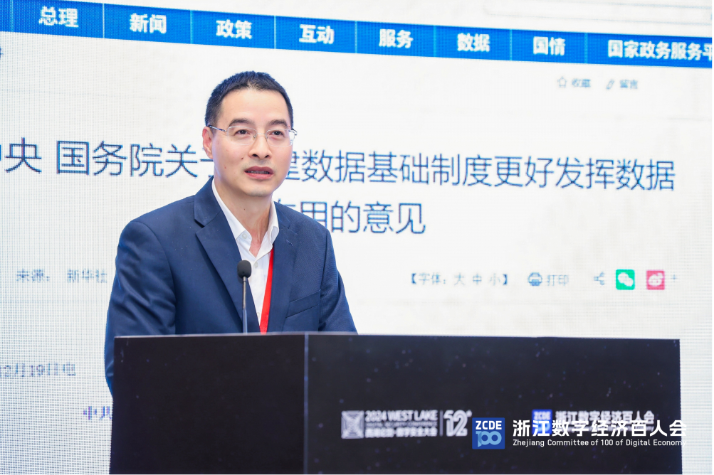 交流发言环节,百人会执委、浙江省政府办公厅副主任、党组成员陈新忠,百人会成员、中国计量大学原校长宋明顺,国家生态环境部信息中心副总工程师张波,百人会成员、浙江省团委副书记、浙江省委党校工商管理教研部主任、教授徐梦周,百人会成员、浙江创联网捷科技有限公司联合创始人、浙大网新健康科技有限公司首席技术官姚畅,分别聚焦数据确权、数据标识、数据安全、数据合规管理、公共数据与企业个人数据融合、数据价值的行业化、场景化和应用化等视角提出相关观点和建议。