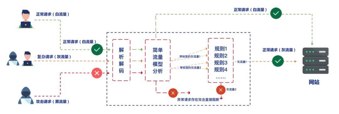 通过自研的人机识别算法和AI学习技术对访问行为进行实时分析和分类,以准确区分正常用户和恶意BOT。管理人员可根据网站的需求和特点,自定义适用的BOT防护规则。