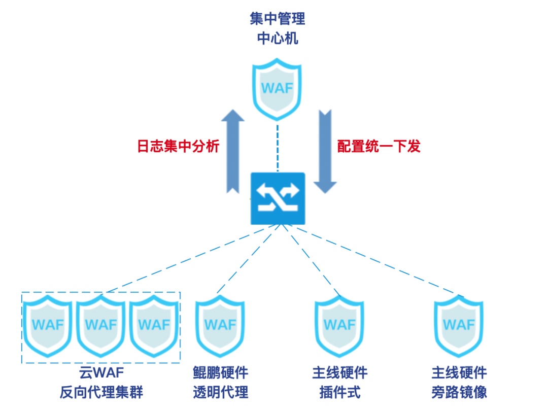 1套WAF集中管理平台可对透明代理、反向代理、旁路镜像、透明桥、插件式部署、HA、集群等不同部署模式的WAF节点进行统一管理。