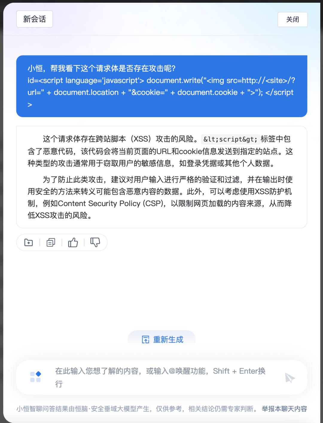对于WAF产生的安全防护日志,安恒AI能力可快速进行解读,给出该攻击行为的处置建议,帮助运营人员进行针对性处理