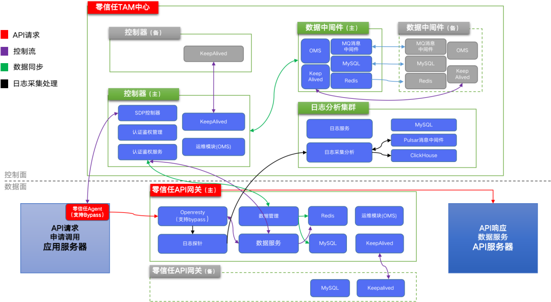 在该运营商的API数据安全建设过程中,考虑到高并发量和可靠性要求,采取了零信任控制器、中间件、日志分析平台和零信任API网关分离式部署方式,且前置负载均衡器支持实现每个组件的高可用部署模式,负载均衡设备对每个组件进行定时健康检查,若存在服务异常将立即切换至备机,保障业务的可靠性。