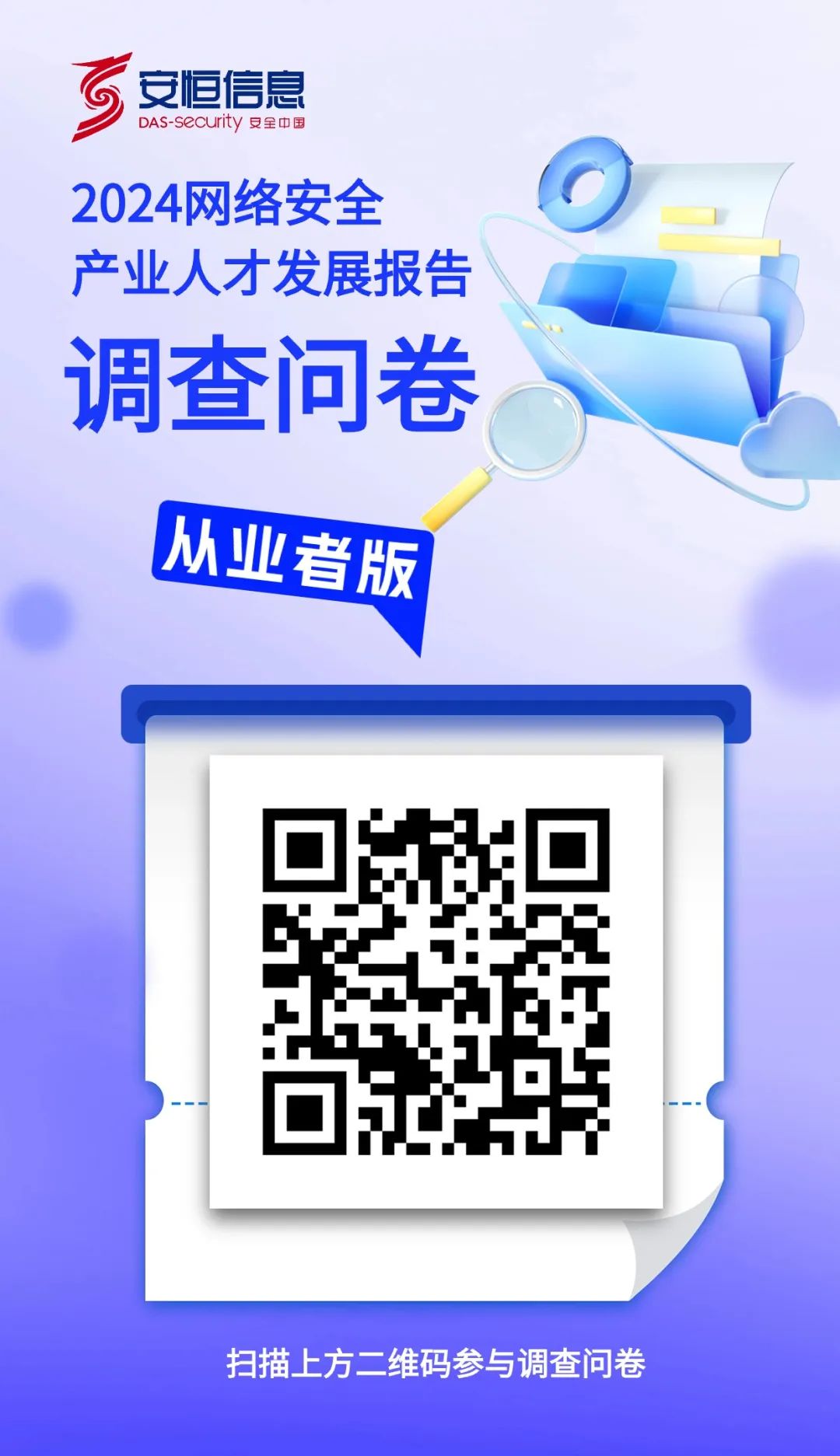 为助力我国网络安全人才培养建设,增加高技能人才培养创新性意见,安恒信息发起《2024网络安全人才发展报告调查问卷-学生版》《2024网络安全人才发展报告调查问卷-从业人员版》,为后续发布《2024网络安全产业人才发展报告》奠定基础。