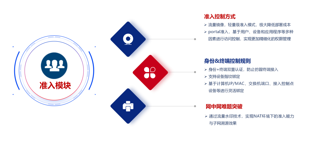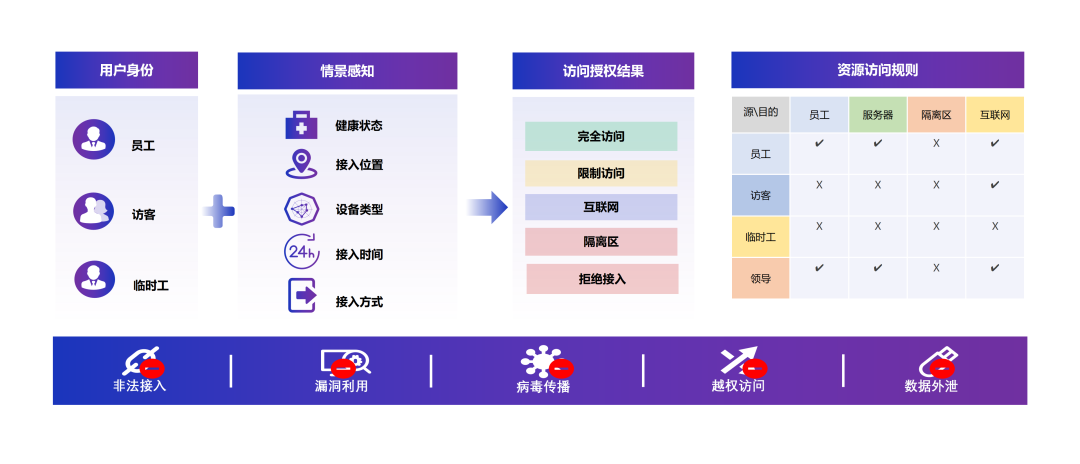 办公人员、外包驻场人员、访客以及临时工(如门卫、保洁等)等愈发多样繁杂的网络接入身份,日常办公内网资源访问、外部网互联网访问等不同的访问需求。此外,不同的接入群体还通过有线和无线方式接入网络,进一步增加了网络管理的复杂性、提升了网络安全风险。一旦网络被攻击或数据被窃取,不仅会影响正常的业务运行,还可能对城市的整体运转造成严重影响。