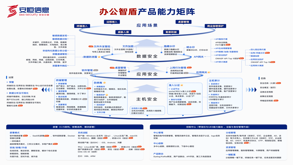 融合零信任、防病毒、主机审计、弱点检测、文件加密保护、数据防泄漏、基线检查、资产盘点、桌面管理、主机防火墙、隐形水印、绿色上网、网络准入、虚拟桌面等多种业务。