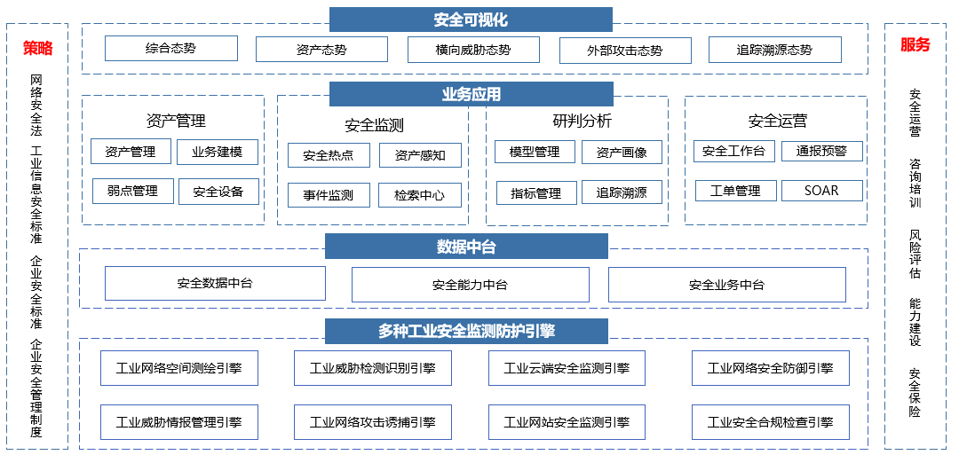 基于大数据分析技术和人工智能算法,将工业安全技术指标与安全生产指标进行进行分析挖掘,提供工业场景下的威胁建模能力,持续监测工业网络安全状态,提供精准的安全告警、趋势分析与预测能力,为工业网络安全决策提供支撑。