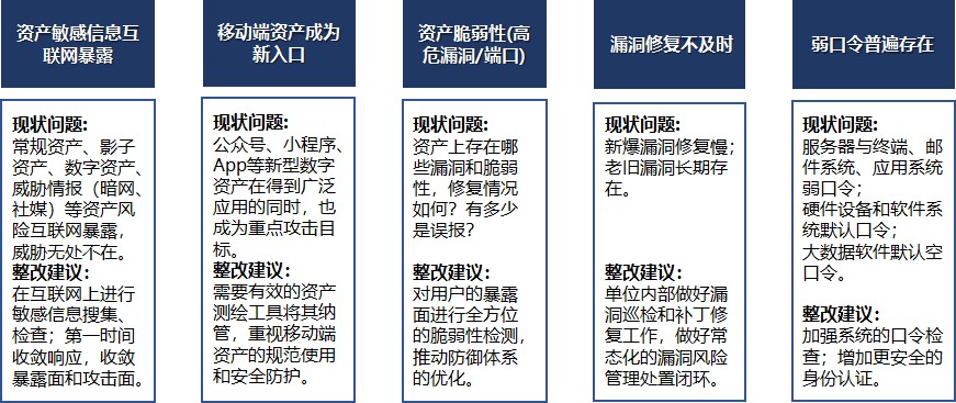 攻防演练大幕已拉开,“两高一弱”(高危端口、高危漏洞和弱口令)问题专项行动也在如火如荼进行,这是通过实践总结出的,网络环境中最常面临的关键安全挑战。与此同时,针对性治理问题为政府机构、企事业单位等带来巨大挑战。以下是安恒信息从“两高一弱”中总结的共性问题及提出的整改建议: