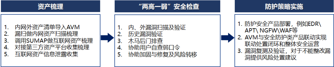 安恒信息“两高一弱”专项检测治理解决方案以全面的检测策略为核心,结合资产暴露面管理、漏洞自动验证,最终实现常态化安全运营目标。同时,我们还会根据最新的安全威胁和攻击手段,不断更新和优化安全防护策略,确保能够持续应对不断变化的安全挑战。