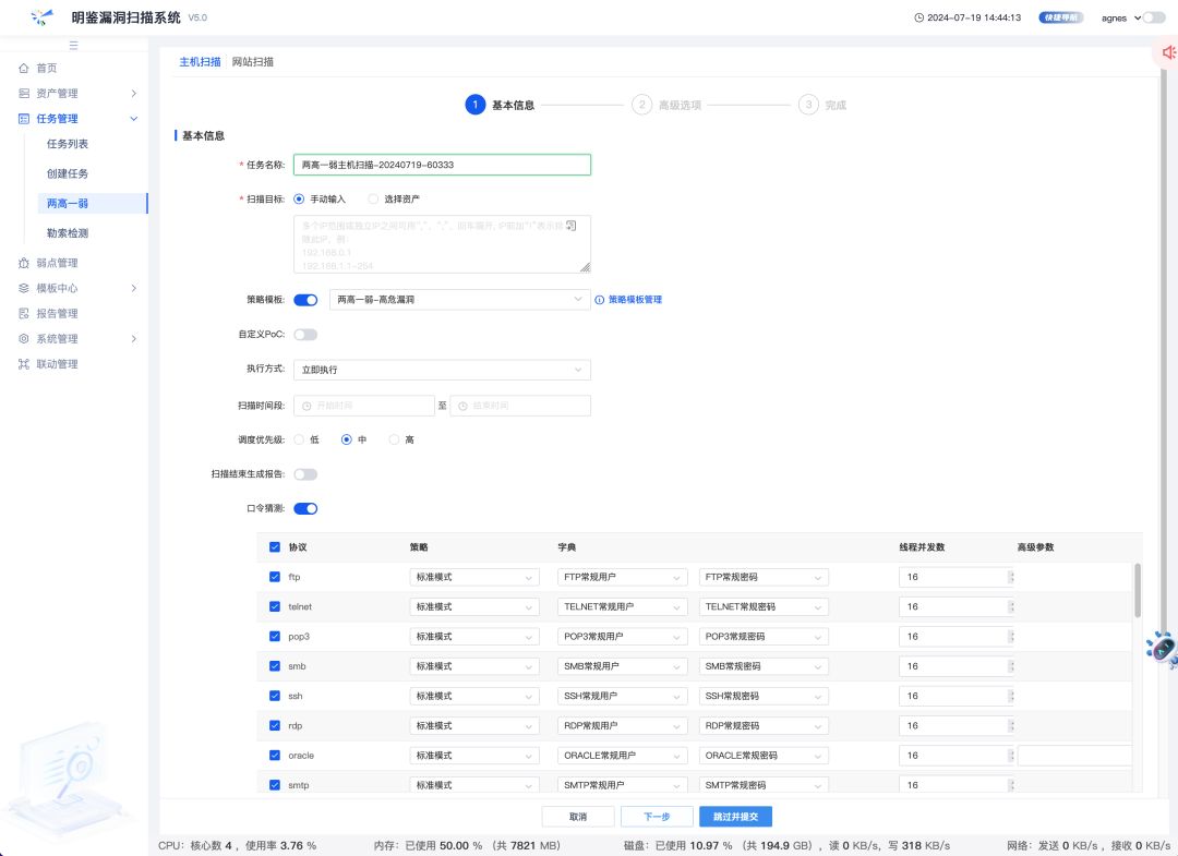 为快速响应客户需求,安恒资产脆弱性扫描与管理平台(AVM)、明鉴漏洞扫描系统新版本增加“两高一弱”专项扫描任务快速入口,依托丰富的行业客户经验,对任务参数模板进行针对性调优,满足各类用户需要,做到任务一键下发、威胁精准检测、报告灵活输出。