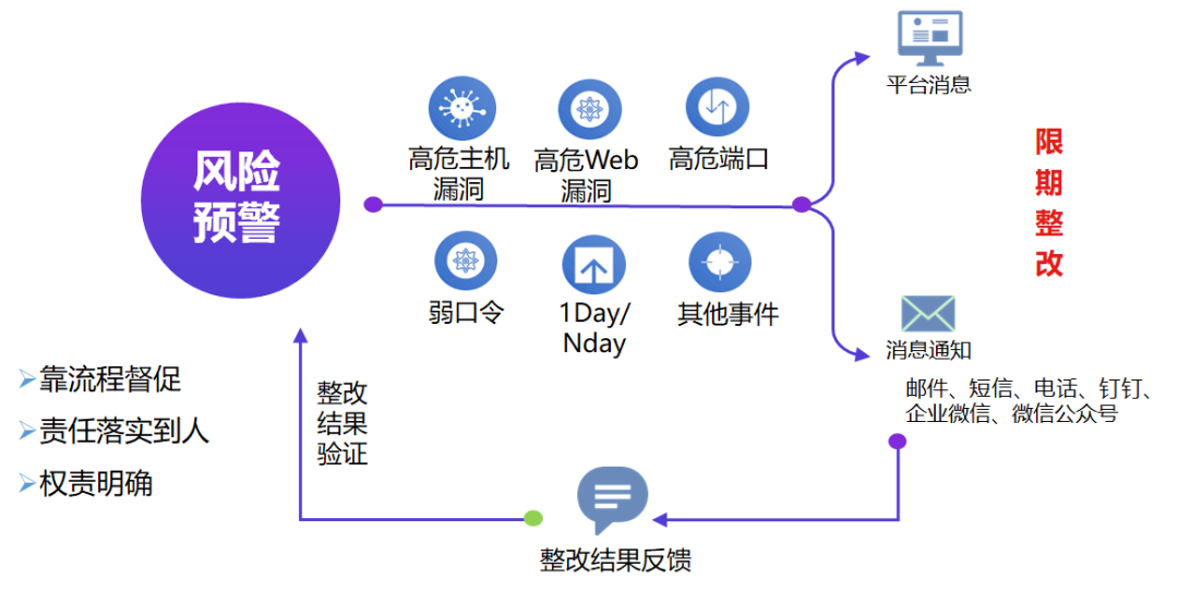针对专项检测发现的高危漏洞、高危端口、弱口令等风险问题,通过灵活的工单流程通报督促相关单位责任人进行整改。