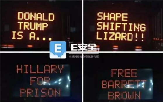 2016年5月,当时多个交通标志被篡改为“Donald Trump is a shape of shifting lizard”,“释放Barrett Brown”(Free Barrett Brown)和“希拉里入狱”(Hillary for Prison)。
