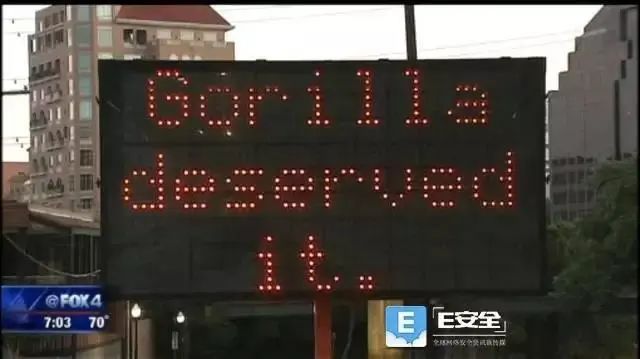 2016年6月5日,在美国达拉斯发生,电子留言板被篡改为“大猩猩自找(Gorilla deserved it)”,意指在辛辛那提动物园,三岁男孩爬过防护栏掉入大猩猩围栏,管理员射杀稀有大猩猩事件;