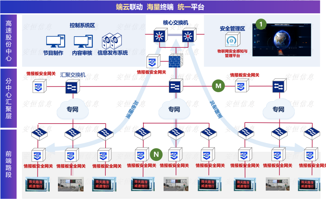 前端路段部署接入侧情报板安全网关、分中心部署汇聚侧情报安全网关、中心部署情报板安全网关和物联网安全感知与管理平台,以下是情报板安全方案整体架构图: