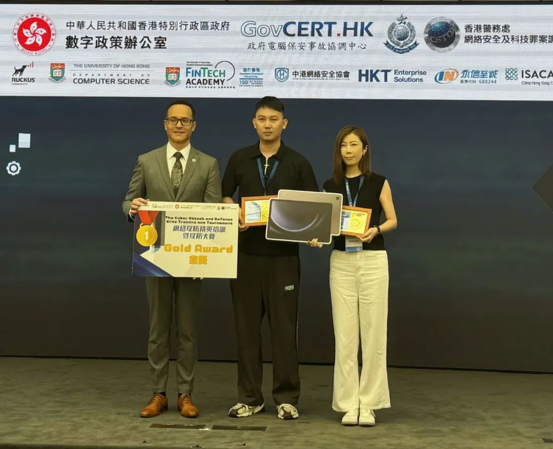 8月2日,由香港警务处网络安全及科技罪案调查科(网罪科)、数字政策办公室(数字办)以及香港互联网注册管理有限公司联合举办的“网络攻防精英培训暨攻防大赛”圆满落幕。此次活动共吸引超过300支队伍、总计740名业界与学界精英加入攻防比赛。安恒信息分子实验室“莲花山小树苗”队凭借扎实的技术功底与丰富的实战经验,荣获公开组金奖(比赛分为公开组与中学生组)。