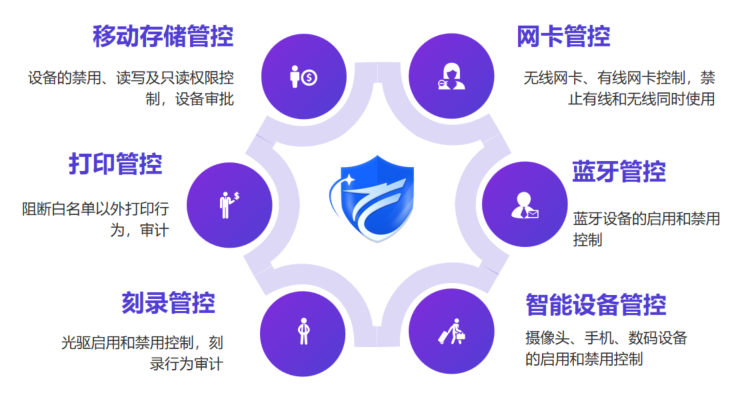 办公智盾还可以管控打印机打印权限和刻录机刻录权限,并可对网卡、蓝牙以及智能设备的使用进行管理,全方位控制外设使用行为。