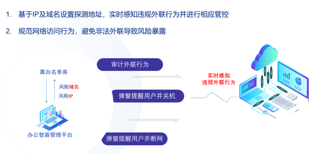 通过违规外联管理策略,可设置网络黑白名单,白名单模式下,员工可访问白名单内网络,访问白名单外网络时被认为是违规外联,将会被阻断;黑名单模式下,员工不可访问黑名单内网络,黑名单外网络可访问。同时可根据时间进行外联管控,可配置在某个时间段内进行管控。