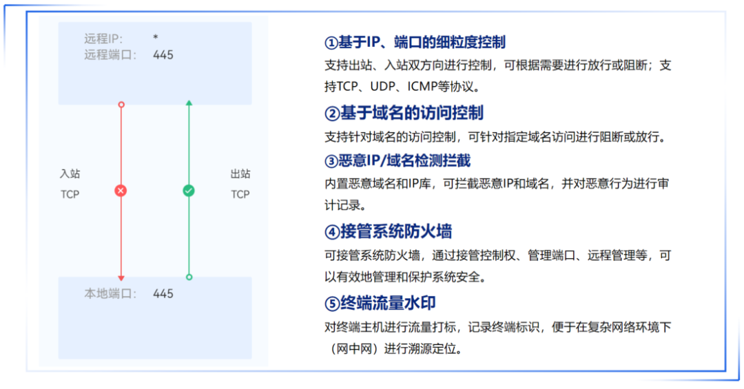通过主机防火墙,基于IP和端口的出入站访问策略,在终端之间建立细粒度的访问控制。可一键封锁终端,或禁止某些具体端口的访问,在内部网络中创建更小的安全区域以限制横向扩散,提升安全性。