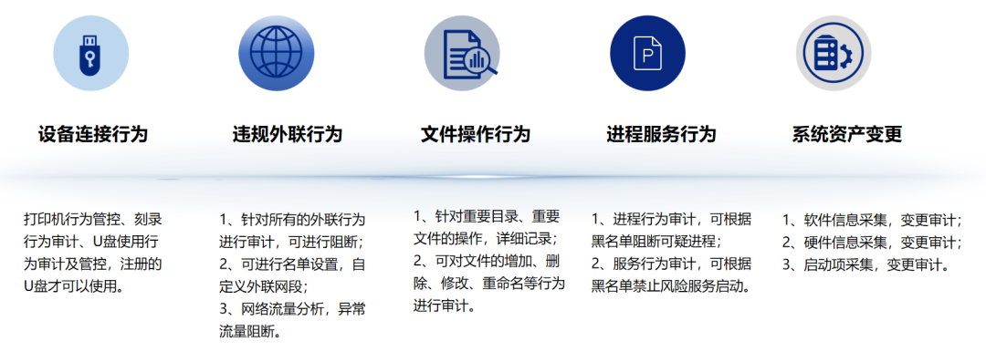 融合零信任、防病毒、主机审计、弱点检测、文件加密保护、数据防泄漏、基线检查、资产盘点、桌面管理、主机防火墙、隐形水印、绿色上网、网络准入、虚拟桌面等多种业务。