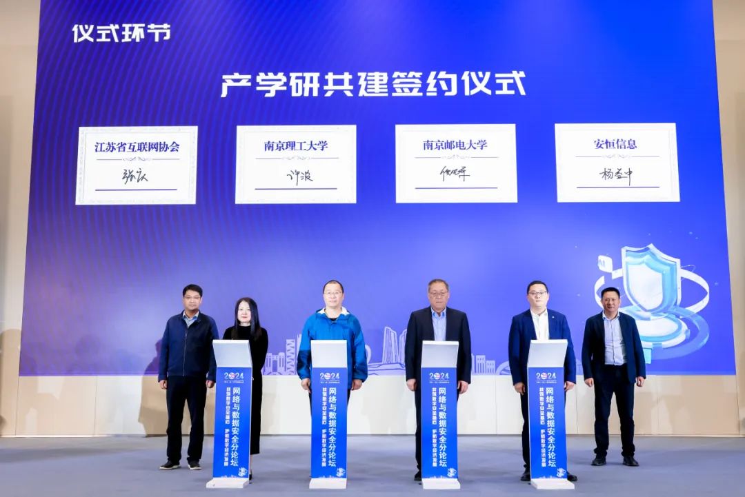 此外,在会议现场,还举办了产学研共建签约仪式活动,江苏省互联网协会副秘书长张庆、南京理工大学江苏省智能交通与车联网工程研究中心副主任许波、南京邮电大学信息化建设与管理办公室主任倪晓军、江苏安恒网络安全有限公司总经理杨益中代表四家单位上台签约。未来,各方将携手推动高校科技创新发展、企业科技成果孵化,以新质生产力推动数字安全产业高质量发展。