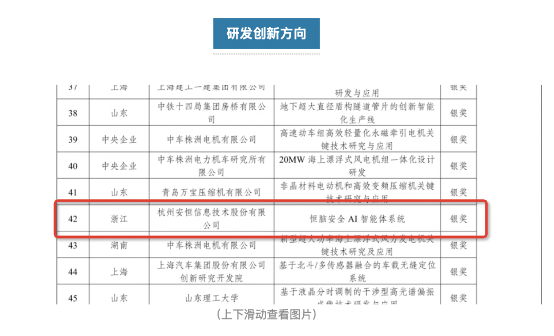 近日,安恒信息恒脑安全AI智能体系统在第十八届 “振兴杯” 全国青年职业技能大赛职工组创新创效竞赛中荣获研发创新方向银奖,充分展现了恒脑非凡的实力和卓越的创新能力,标志着其在AI+安全领域的研发与应用水平已达到较高水准。安恒信息作为获奖的唯一一家网安企业,再次以其行业领先的智能化探索和全方位实践脱颖而出,获得肯定。