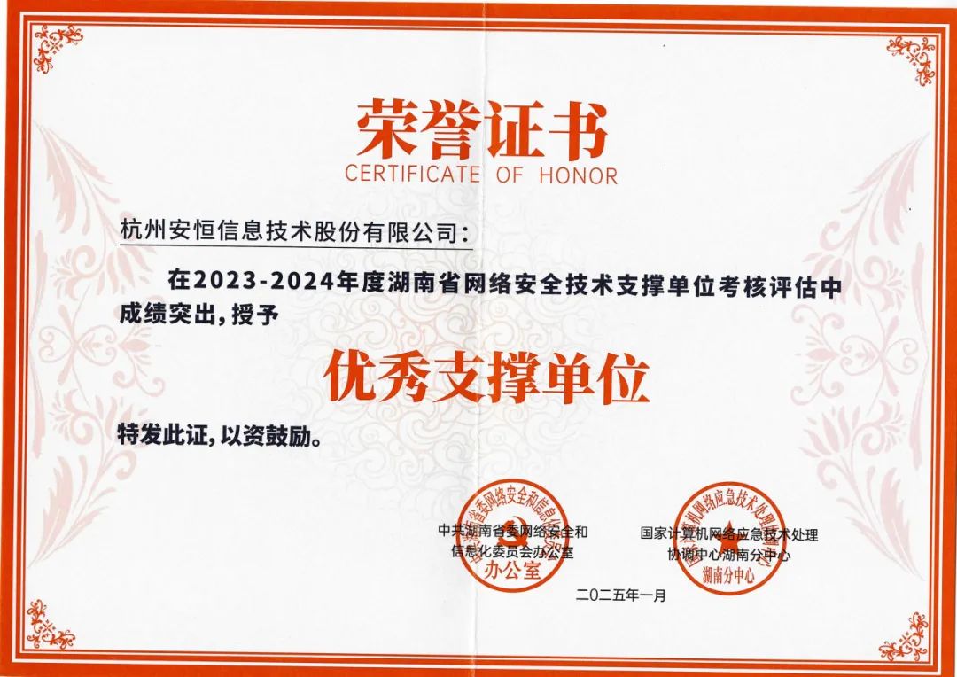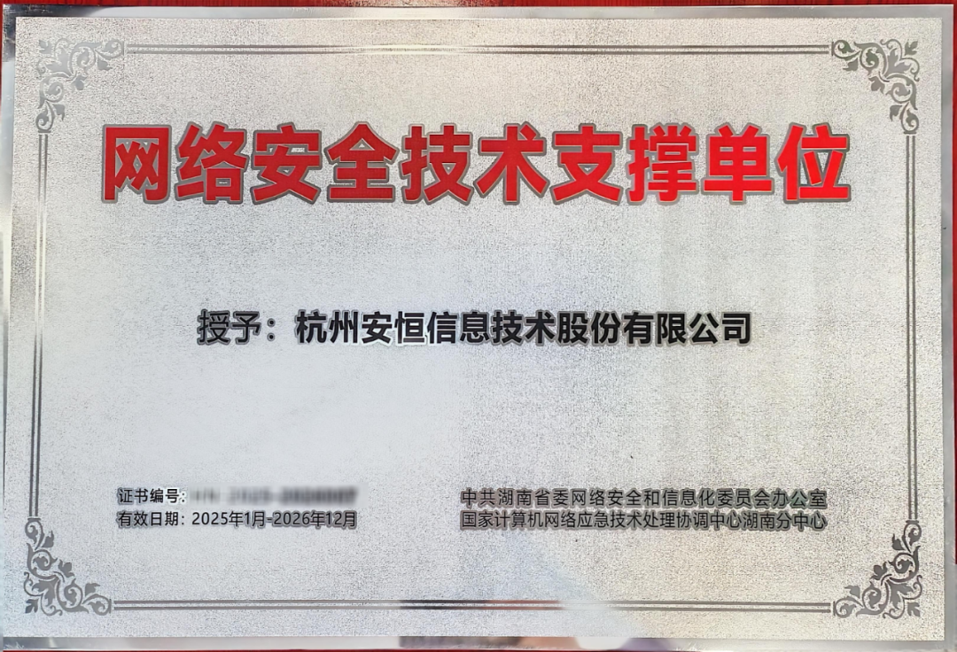 1月22日,湖南省委网信办、国家互联网应急中心湖南分中心举办的2024年湖南省网络安全技术支撑单位年度工作会议暨2025-2026年度支撑单位授牌仪式顺利举行。会上,安恒信息获颁“优秀支撑单位”并授予入选“湖南省委网信办2025-2026年度网络安全技术支撑单位”,以表彰其在湖南省网络安全技术支撑工作中所作努力与贡献。