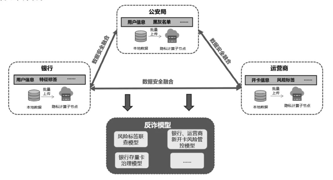 使用隐私计算技术,实现公安、银行、以及运营商三方包括标签数据在内的多项数据的安全融合,创建相应的反诈模型。