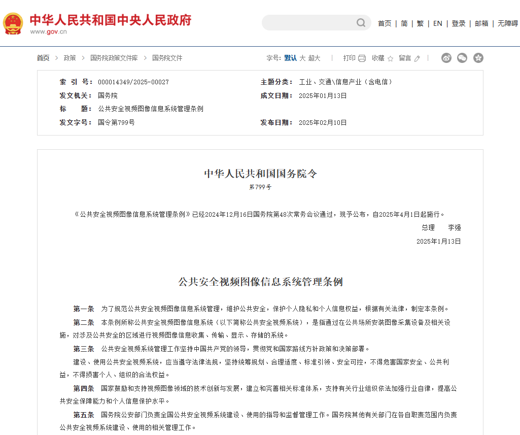 《公共安全视频图像信息系统管理条例》(以下简称《条例》)已经2024年12月16日国务院第48次常务会议通过,现予公布,自2025年4月1日起施行。