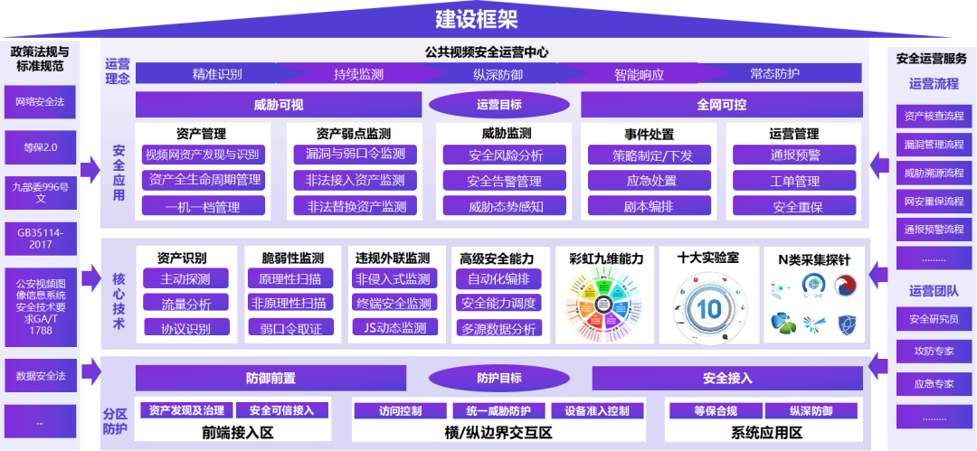 安恒信息经过十数年的行业聚焦和技术积累,研发了一系列视频安全防护产品和沉淀了视频专网的安全运营服务经验,以下是安恒公共视频专网安全建设框架: