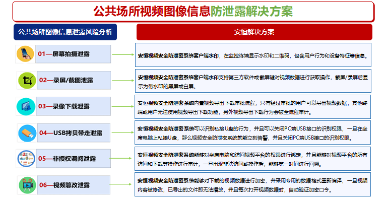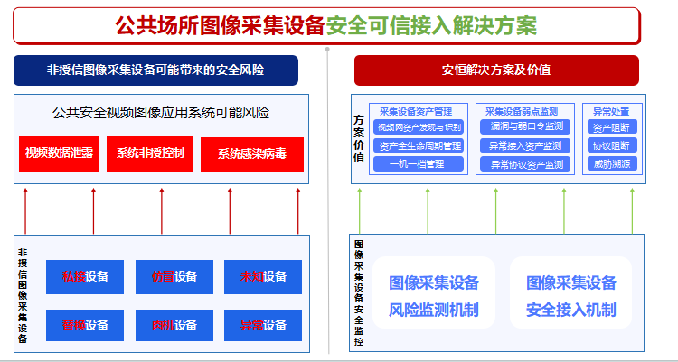 针对公共场所图像采集设备和公共场所视频图像信息,安恒信息提出了对应场景化的方案,以下是对应主体的安全风险和方案及价值: