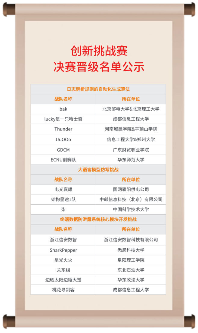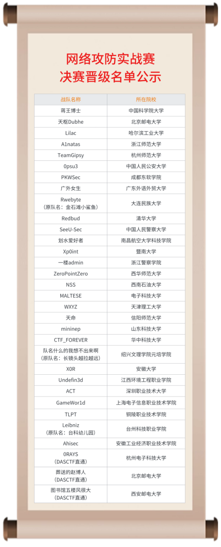 大赛自启动以来,吸引了全国众多高校及企业战队的踊跃参与,经过层层筛选,初赛结果已尘埃落定,网络攻防实战32支战队、创新挑战赛15支战队,脱颖而出晋级决赛。