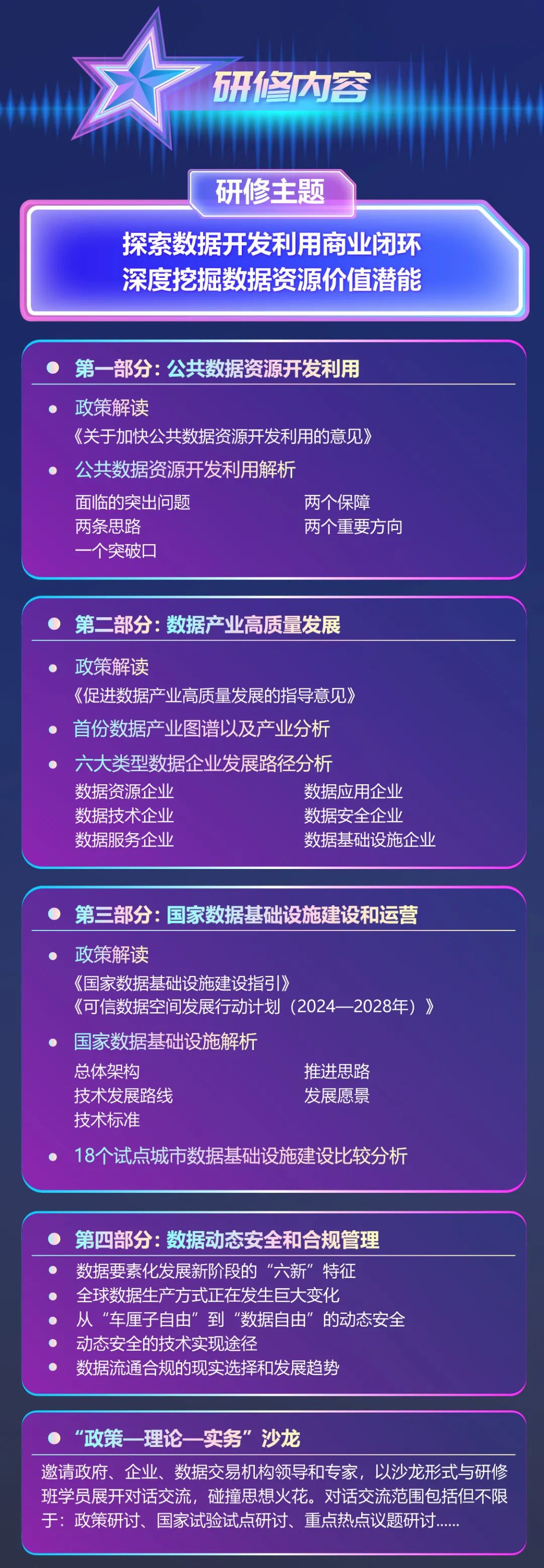为了深入贯彻落实中共中央、国务院《关于构建数据基础制度更好发挥数据要素作用的意见》(“数据二十条”),中共中央办公厅、国务院办公厅《关于加快公共数据资源开发利用的意见》,深刻学习领会国家数据局近期发布的数据产业、企业数据资源开发、数据空间、公共数据授权运营、数据资源登记、国家数据基础设施建设指引等相关文件精神,提高各地方各部门各企业数据资源开发利用水平,培育更多既熟悉数据流通技术,又懂得数据安全合规,还能推进数据流通应用的复合型数据人才,南京邮电大学与北京交通大学、数据要素创新实验室决定联合举办“数据要素创新卓越人才研修班”。