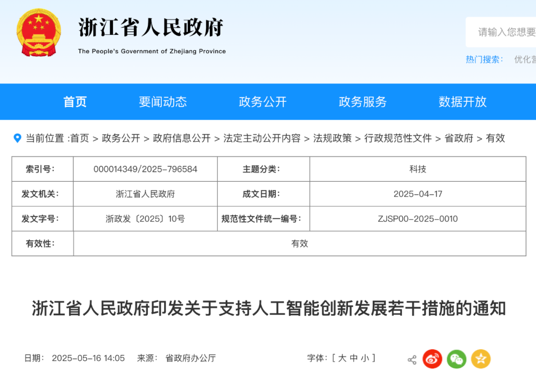 近日,浙江省人民政府印发《关于支持人工智能创新发展若干措施》(以下简称《若干措施》),出台6方面27条举措,以系统性政策框架锚定人工智能发展制高点,打造全球人工智能创新发展高地,提出到2027年实现人工智能核心产业营收超1万亿、2030年突破1.2万亿的宏伟目标。这不仅彰显了浙江抢占全球AI竞争主导权的决心,更是通过具体措施构建了“产业集聚-人才培育-技术攻坚-场景应用”的全链条支持体系,积极探索人工智能发展的“浙江路径”。