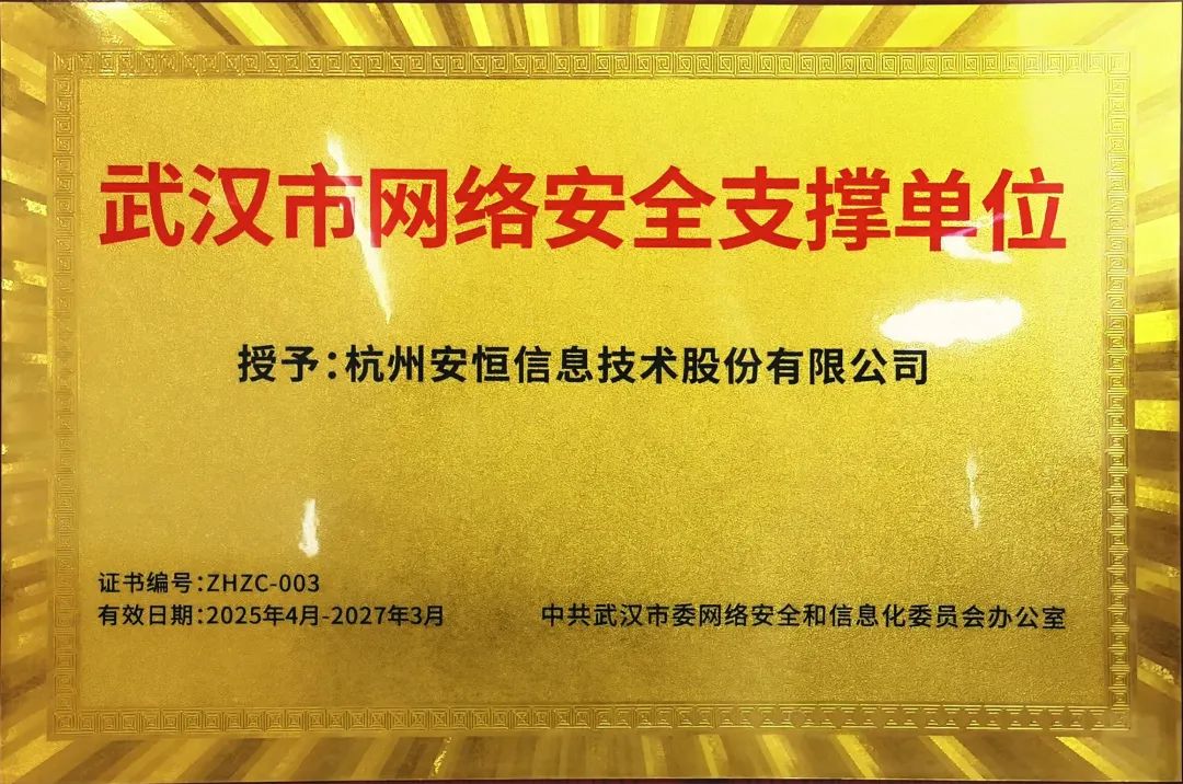 近日,安恒信息凭借在网络安全领域的卓越表现和对武汉市网络安全工作的重要贡献,荣获由武汉市委网信办颁发的 “2024 年度武汉市网络安全优秀保障单位” 称号。这一荣誉不仅是对安恒信息在网络安全保障能力的高度认可,更是对其在推动武汉市网络安全生态建设中所发挥关键作用的有力肯定。