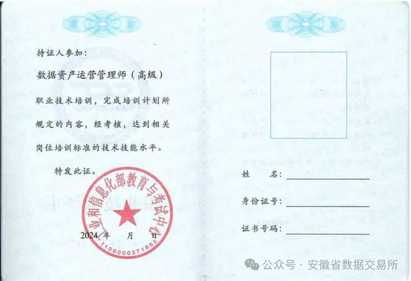所有学员完成培训学时后,均可参加工业和信息化部教育考试中心规定的高级职业技术考核,通过后可申请由工业和信息化部教育与考试中心颁发的“数据资产运营管理师”职业技术证书。学员信息可在工业和信息化部教育与考试中心培训评价证书查询系统(www.miiteec.org.cn)查询。