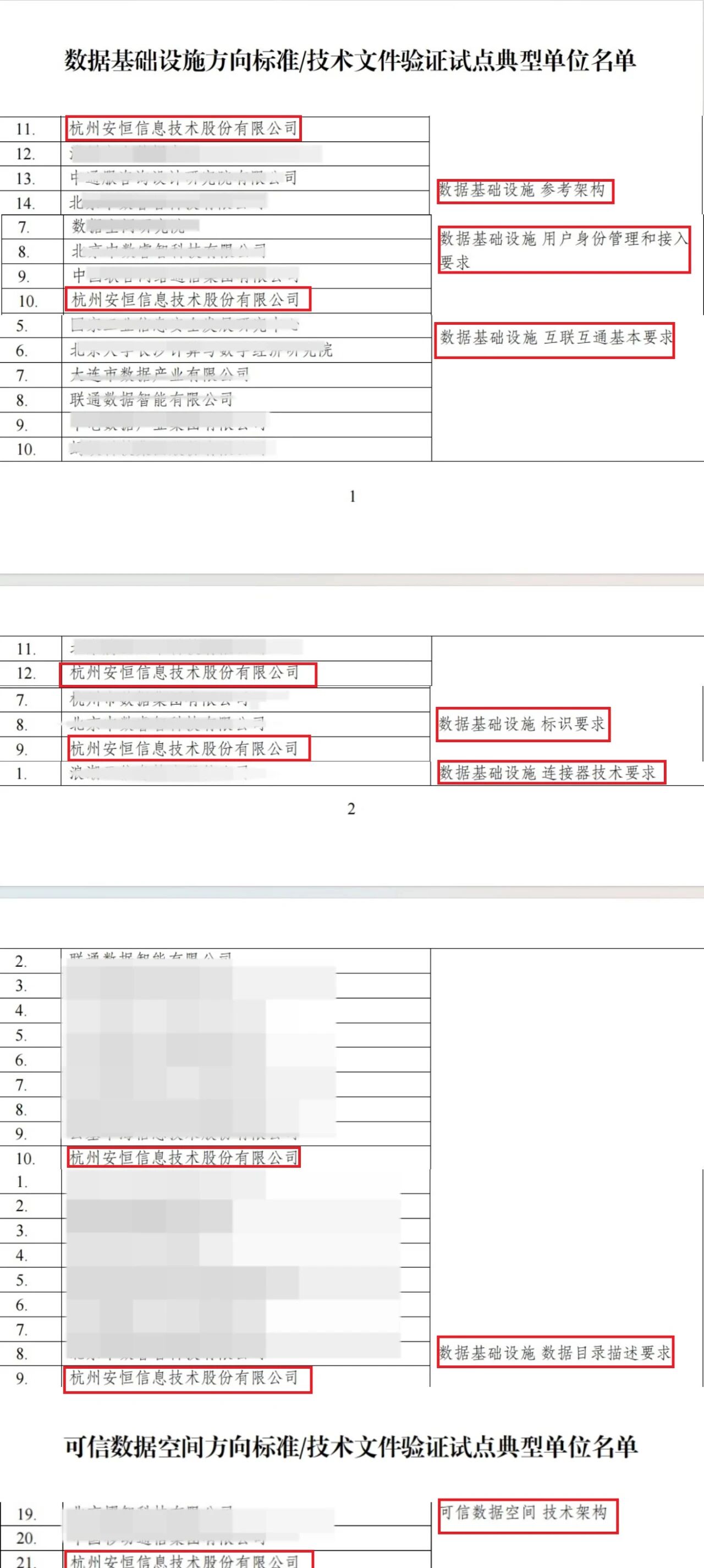 近日,在国家数据局指导下,全国数据标准化技术委员会开展了数据基础设施、可信数据空间等6大重点方向标准和技术文件的标准验证试点工作。经形式审查、标准验证、报告评审等层层审核,安恒信息入选数据基础设施方向和可信数据空间方向的全部6个标准及1个技术文件的验证试点典型单位。这标志着安恒信息在数据领域的技术实力和实践成果获得国家级认可!