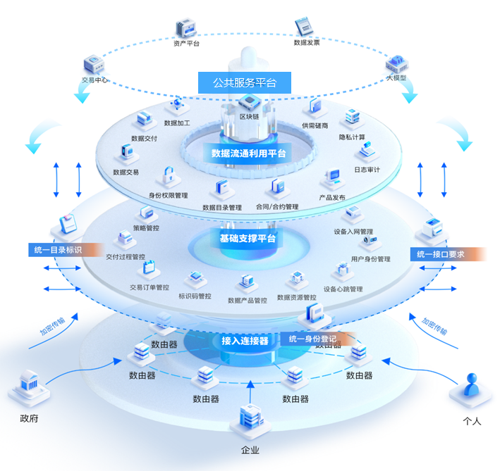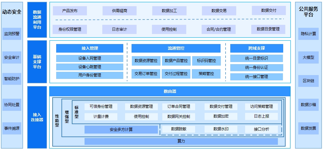 其架构清晰,就像搭积木一样分层构建:最底层是 “数由器”(数据接入终端),中间是基础支撑平台和数据流通利用平台,再加上动态安全防护和统一对接服务保驾护航。